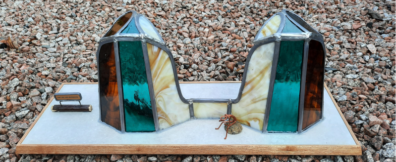 Dit indrukwekkende glas-in-lood stuk maakte Anton bij mijn fantasyroman Dal van vertrouwen. De symboliek heeft Anton heel treffend en origineel weten te vatten. In het dal van duisternis is er geen geborgenheid. In het kale landschap zit je gebogen onder de hemel. Maar wanneer je wisselt van perspectief verschijnen er beschuttende vleugels. Het dal wordt een plek waar jij ruimte krijgt om te verdiepen in veiligheid, ook al zijn de omstandigheden in je leven heel moeilijk. Gods adelaarsvleugels brengen nieuw zicht op je leven. Wanneer het licht door het glas-in-lood schijnt wordt dit dal bovendien bijna een magische plek waar je als vanzelf ademloos bij gaat neerzitten. Juist in het dal gebeuren er wonderen. Dankjewel Anton, dat jij zo'n teder kunstwerk hebt kunnen maken, dat erkenning en herkenning geeft. - Mirjam van der Vegt, auteur en stiltetrainer.